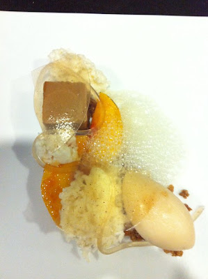 Black strap molasses royale cube, brûléed peaches, oat crumble, peach ginger black tea sorbet, ginger microwave cake, rye wiskey noodle and bubbles, Cataluna spice tuille.
